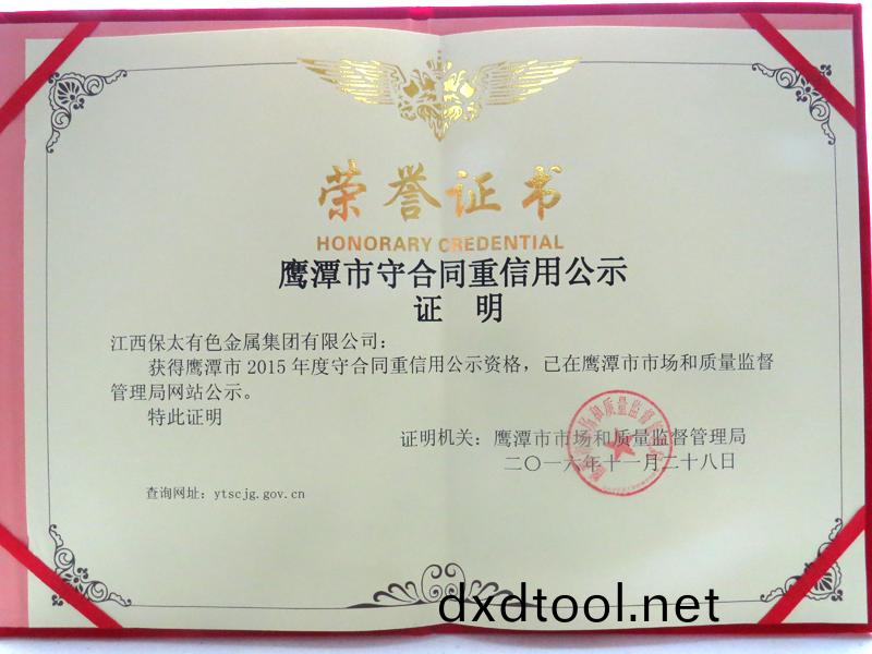 ? ?Recently, our company has won the qualification of "YingtanCity Contract seriously Credit Enterprise in 2015'' again. For enterprises thatdeclare "abide by the contract and attach importance to credit", theAdministration for Industry and Commerce will comprehensively evaluate itsbasic information, enterprise brand management level, enterprise contractcredit management level, corporate contract performance ability and situation,corporate operating efficiency, corporate social responsibility and credit,corporate social honor, and so on, then the outstanding enterprises that havebeen strictly screened through layer by layer can win this honor. Our companyhas won this honor for many years in succession.
