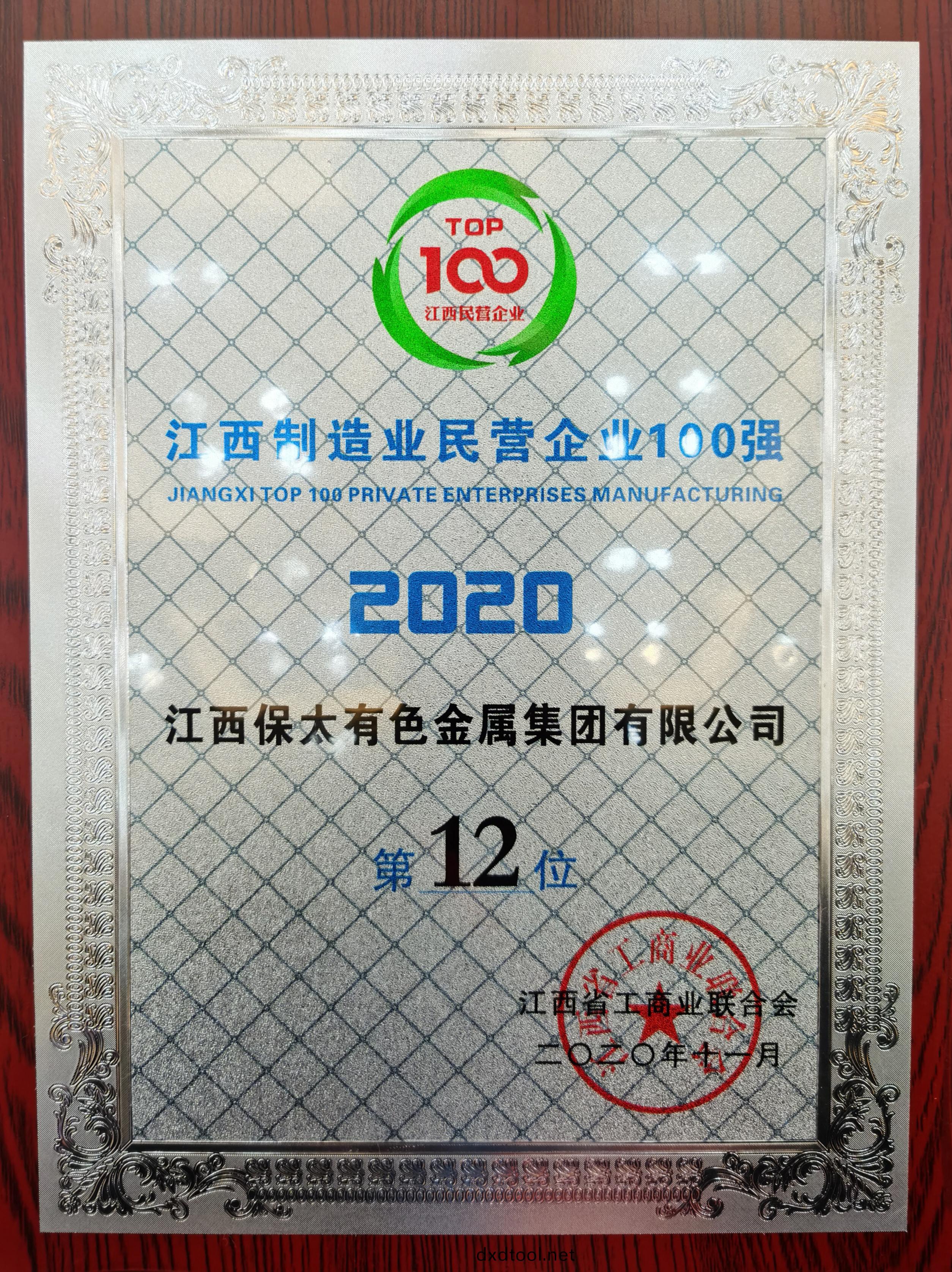 ? ?On November 8, 2020, the jiangxi Top 100 Private Enterprises 2020 Summit hosted by Jiangxi Federation of Industry and Commerce was held in Nanchang. Jiangxi Baotai Group ranked 24th among the Top 100 Private Enterprises 2020 in Jiangxi province and 12th among the Top 100 Manufacturing Private Enterprises in Jiangxi Province, and was also selected as an excellent case in Jiangxi Private Enterprises Social Responsibility Report (2020).
